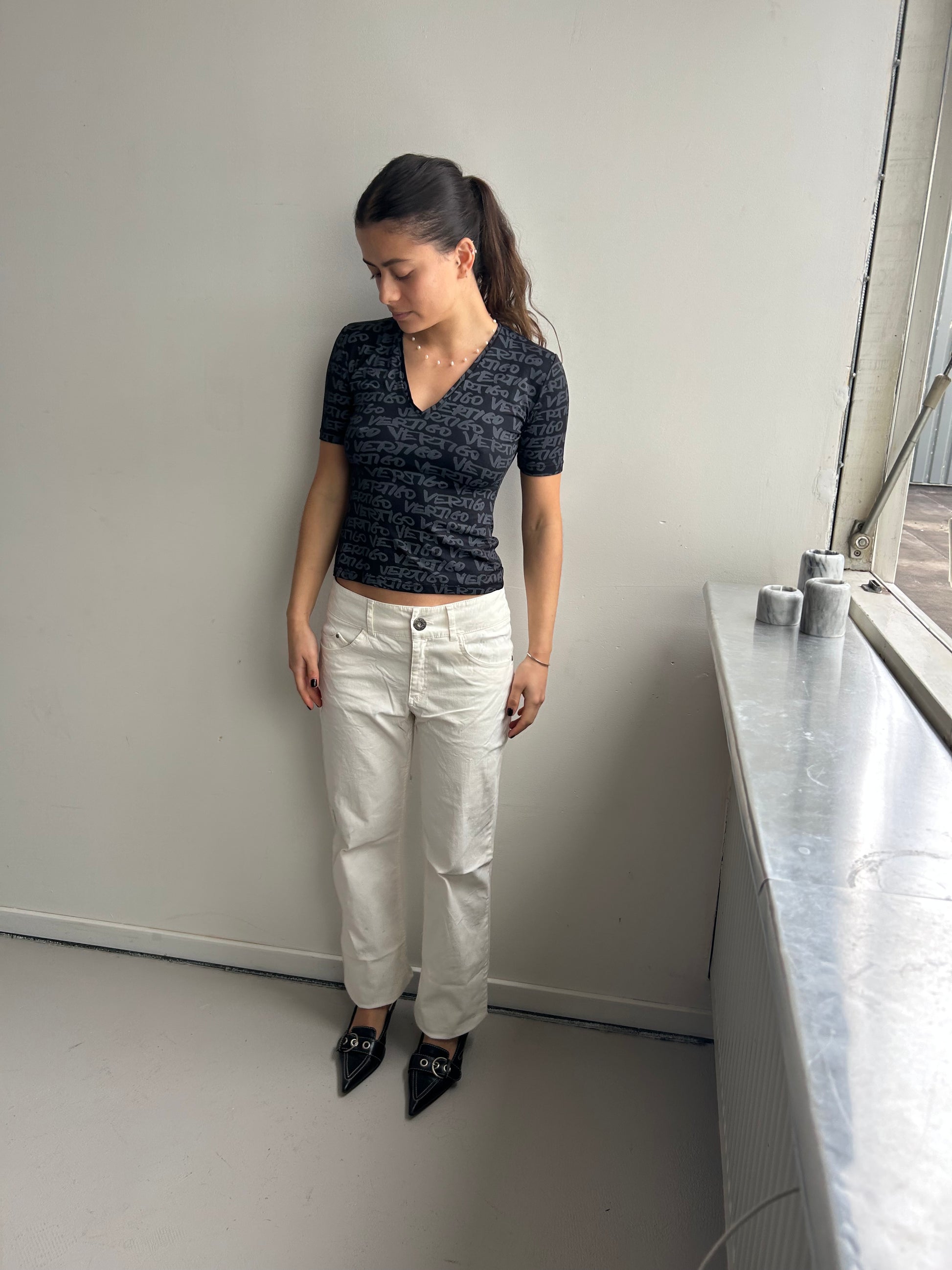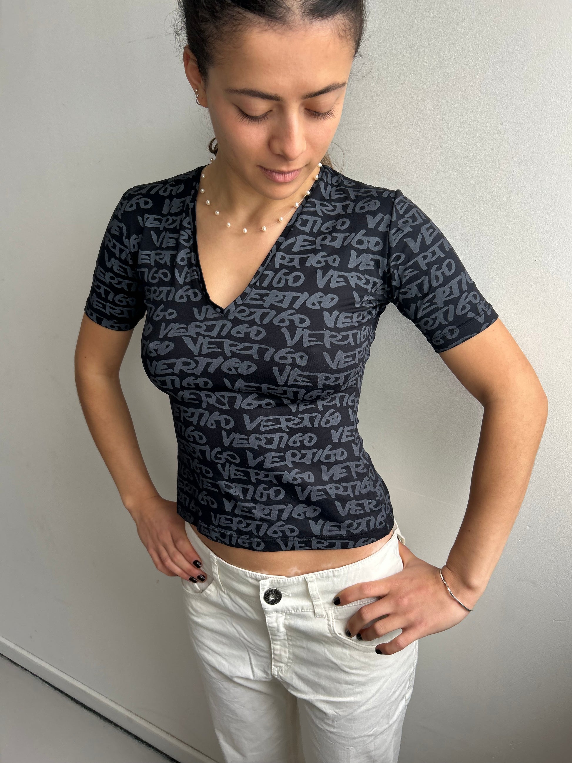 Stretchy black shirt featuring a monogram print with dark grey letters. The fabric is stretchy, snatched and figure hugging. Best for size S/M. Model is size S and wears a C-Cup.