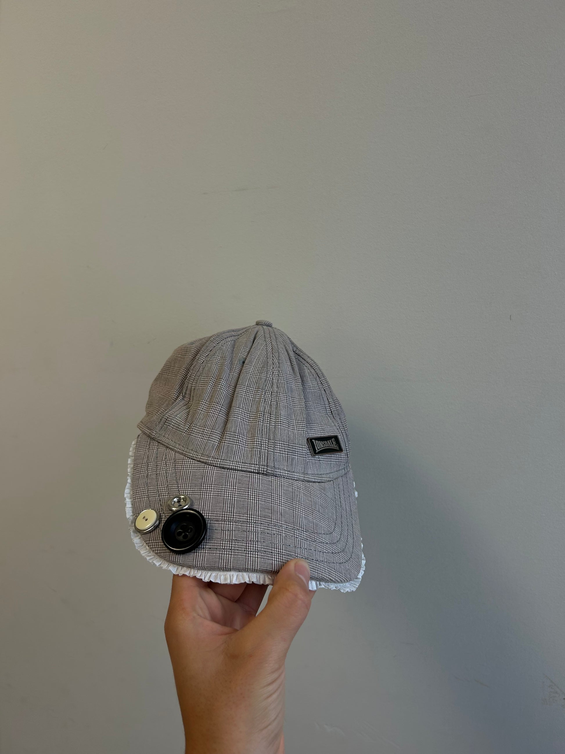 Adjustable grey cap with plaid pattern. Cap upcycled with additional button and ruffle details.