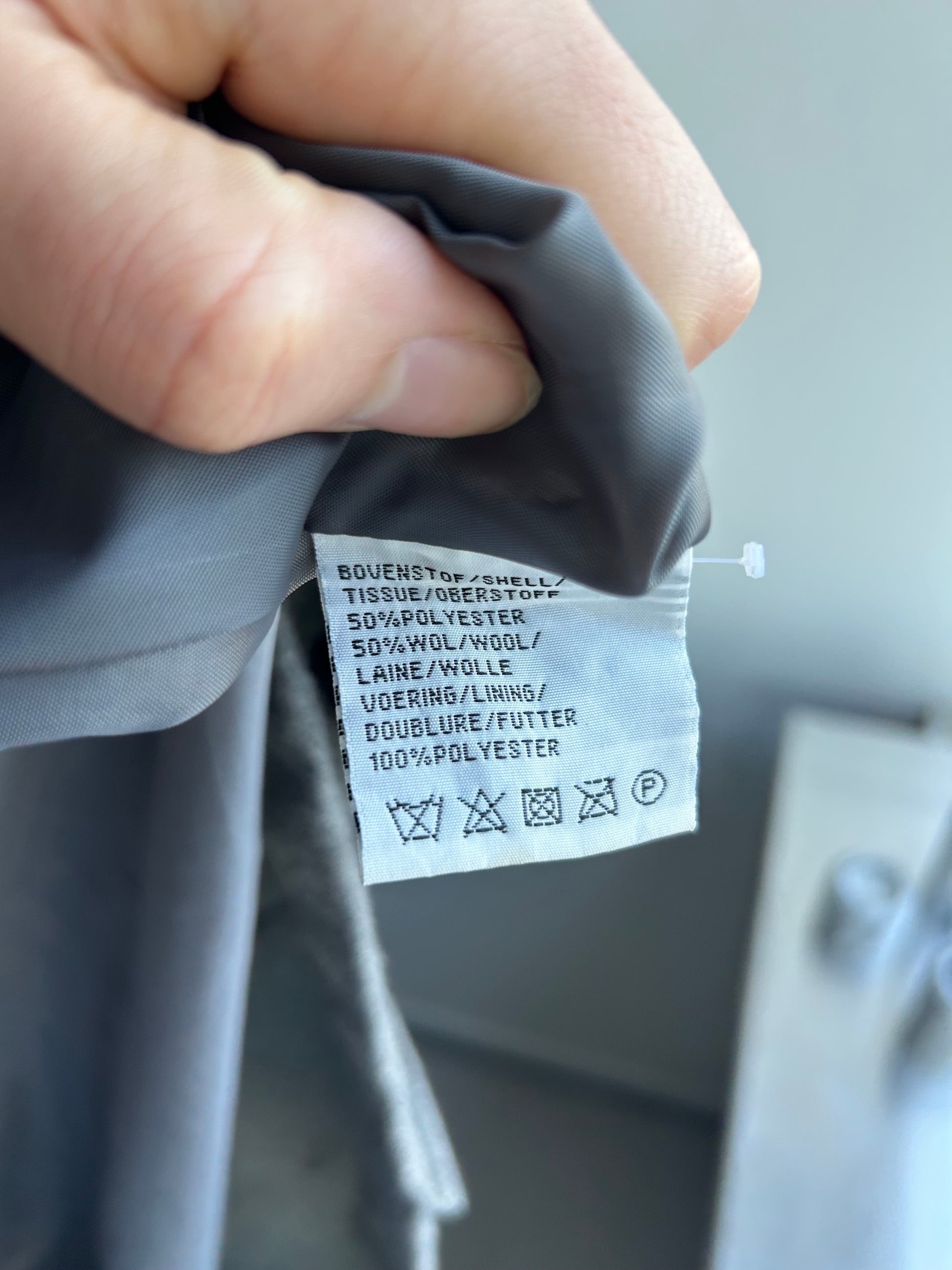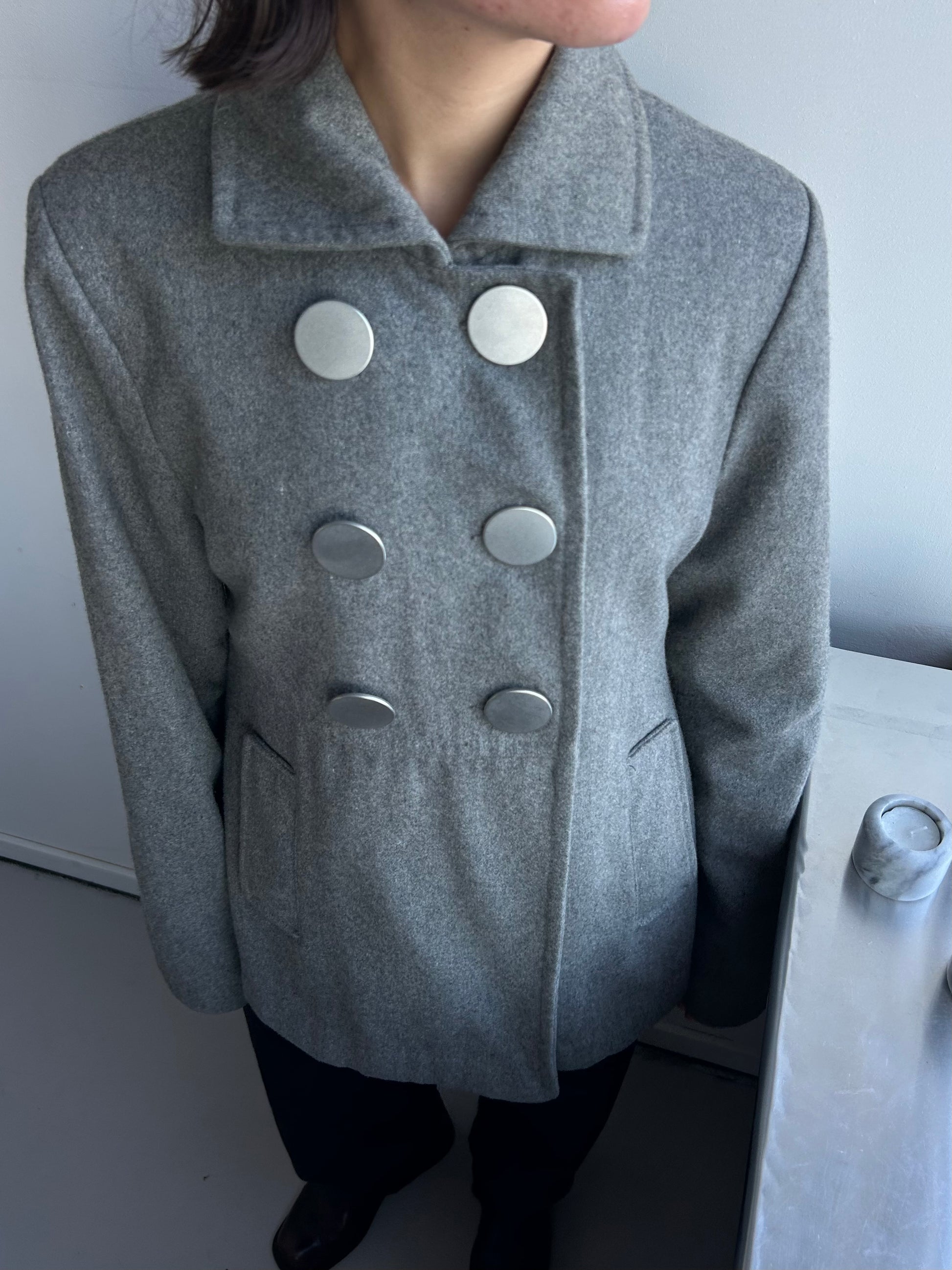 This grey wool coat comes in a Peacoat style appearance with a flattering accentuation around the waist. It features big metallic buttons, a sophisticated collar, and side pockets. Model is size S. Best for size S, M for and L for a snatched, original fit.