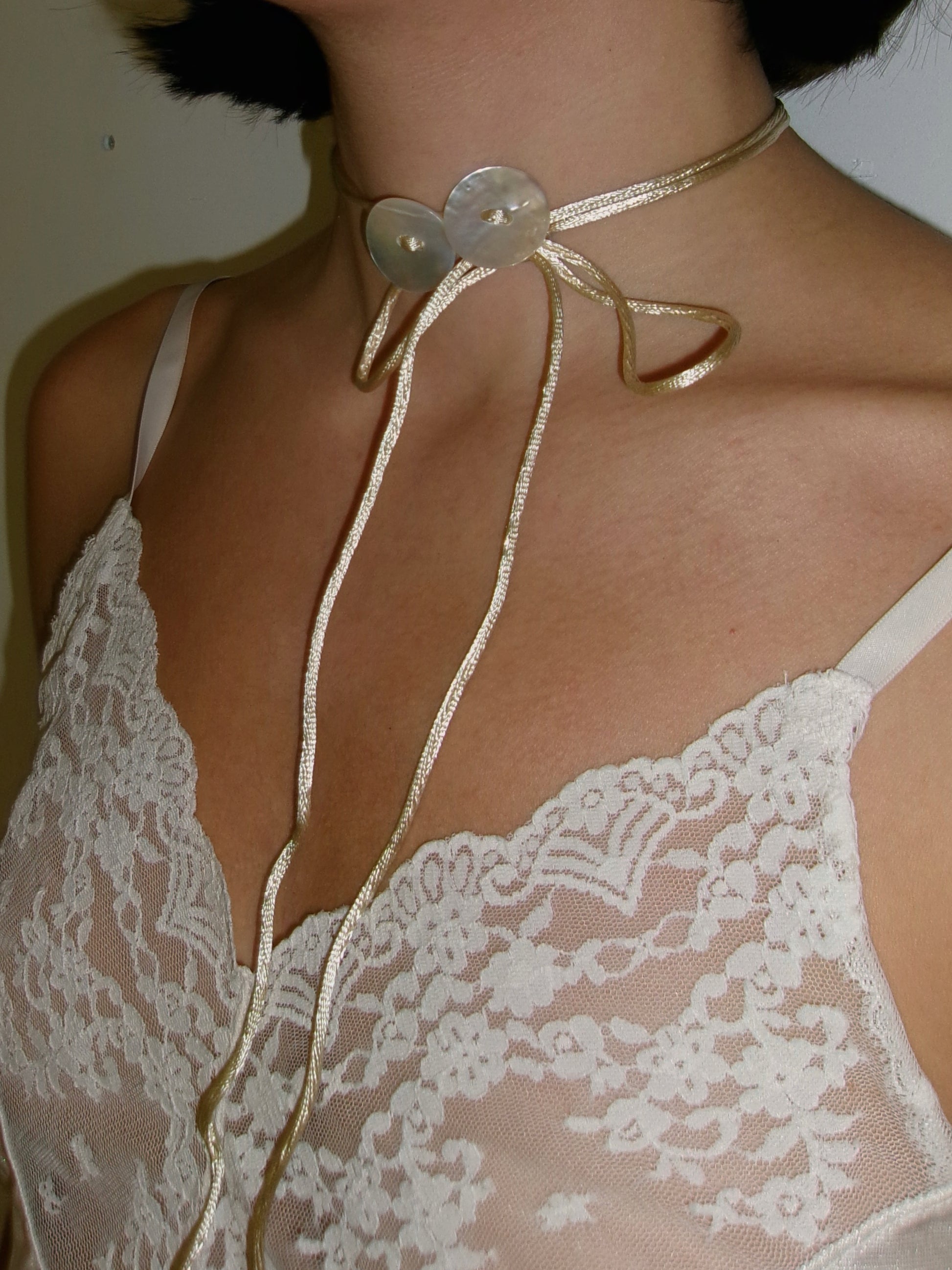 This necklace featuring two mother-pearl-shell buttons comes in two options (leather & satin cord) with different lengths.