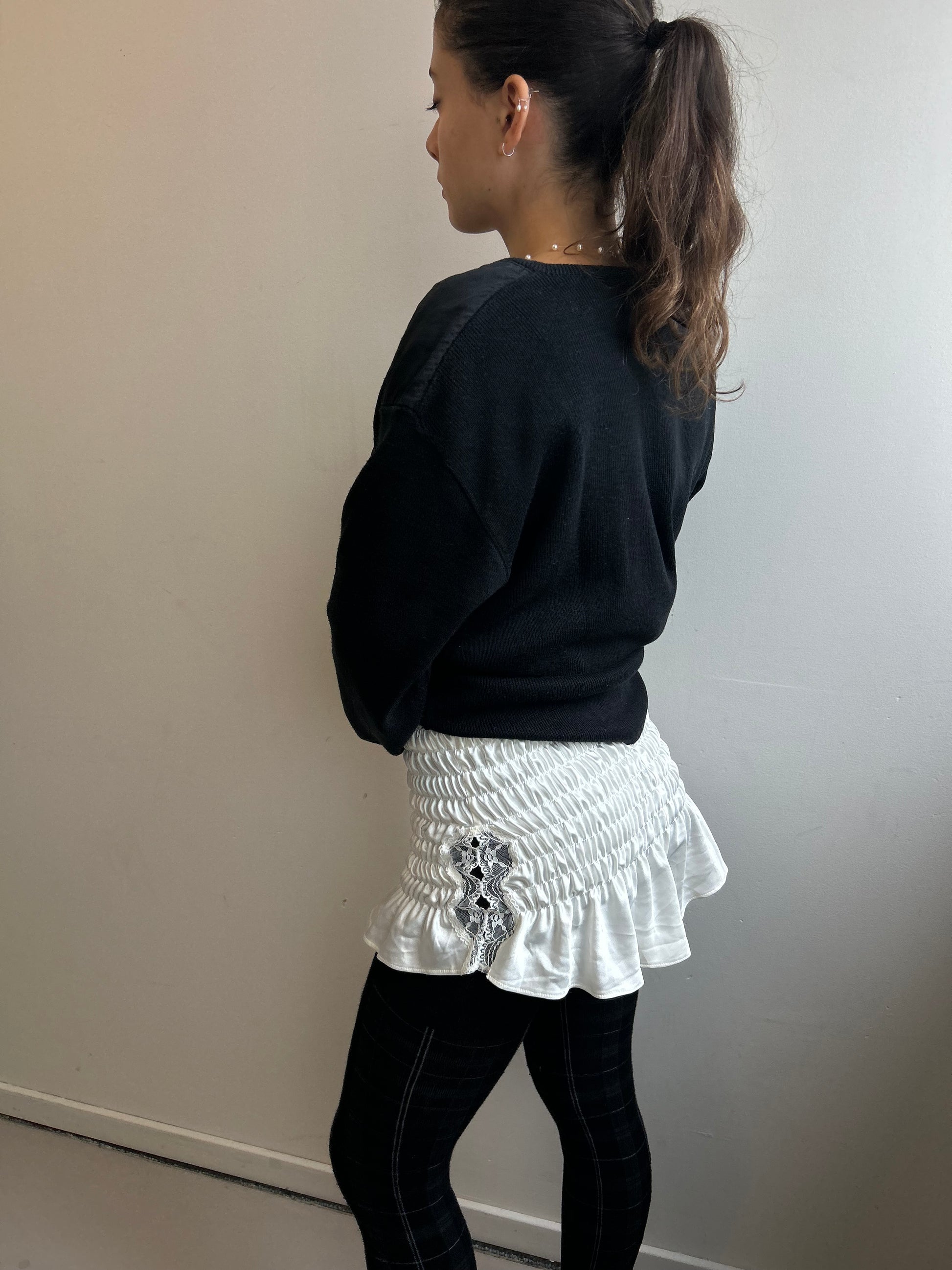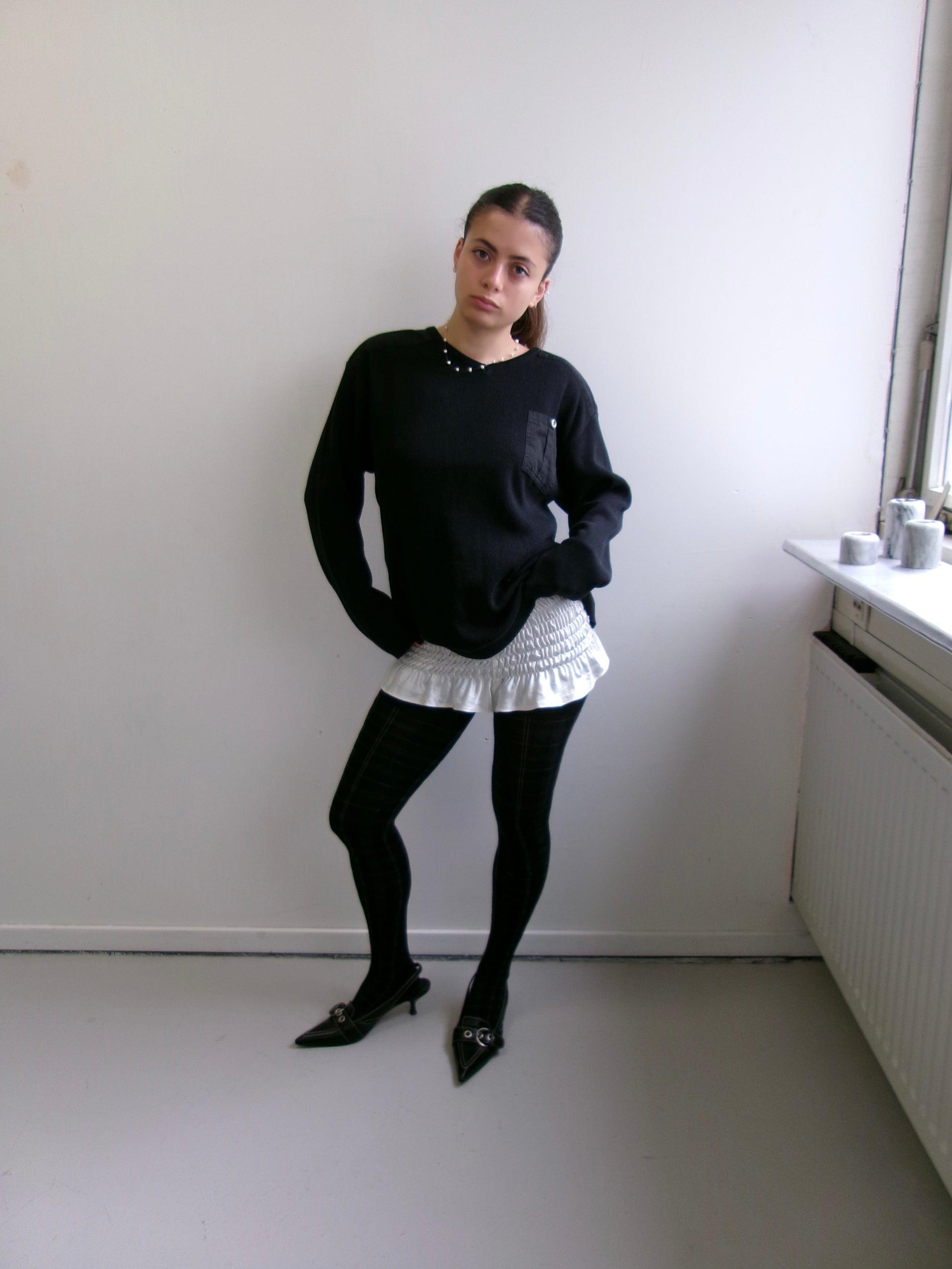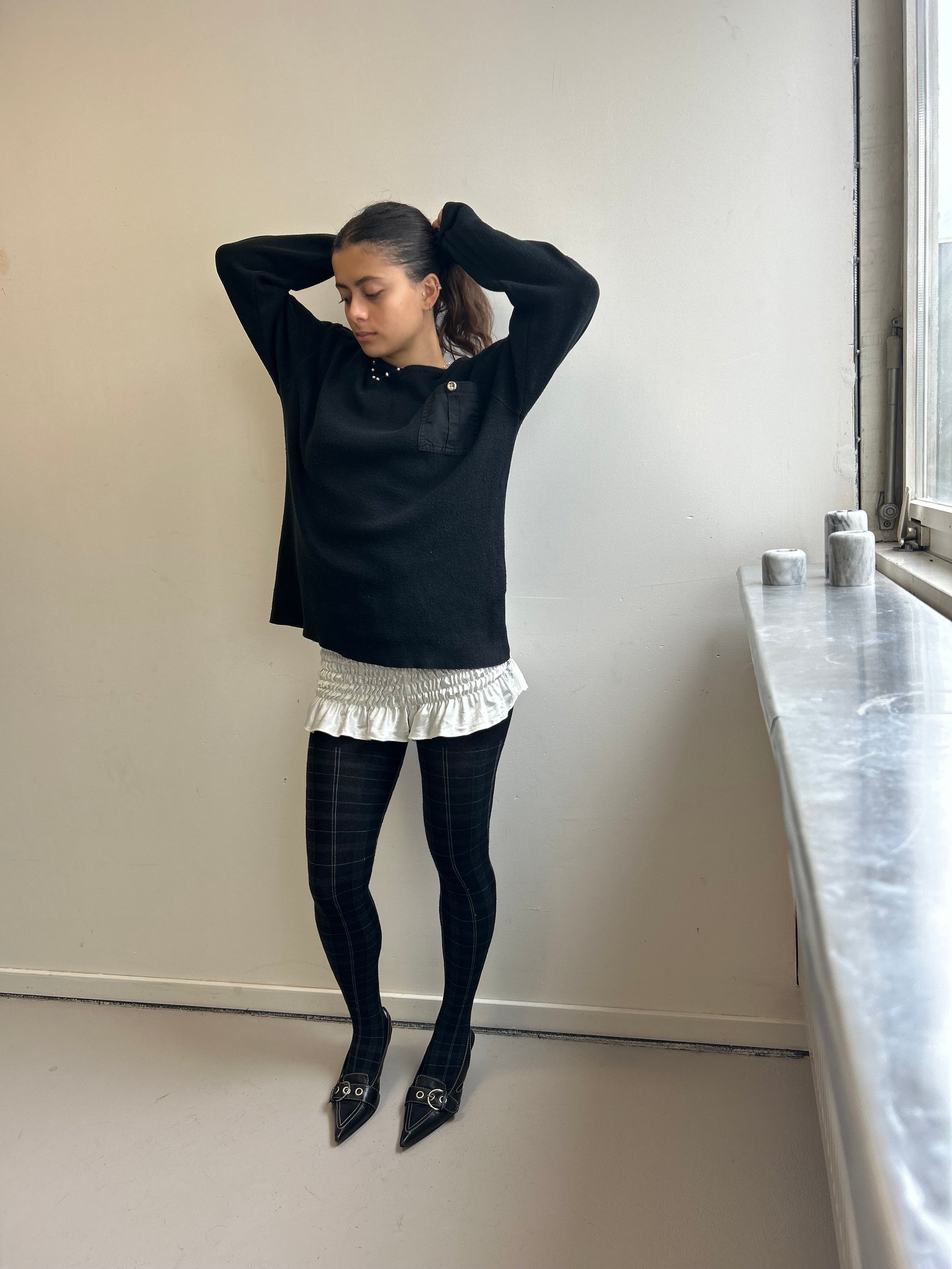 This dark navy knit is featured a pocket with a decorative chrome button. Pocket and button have been sewn by hand at the ilgega atelier. Fits S-L. Model is size S.