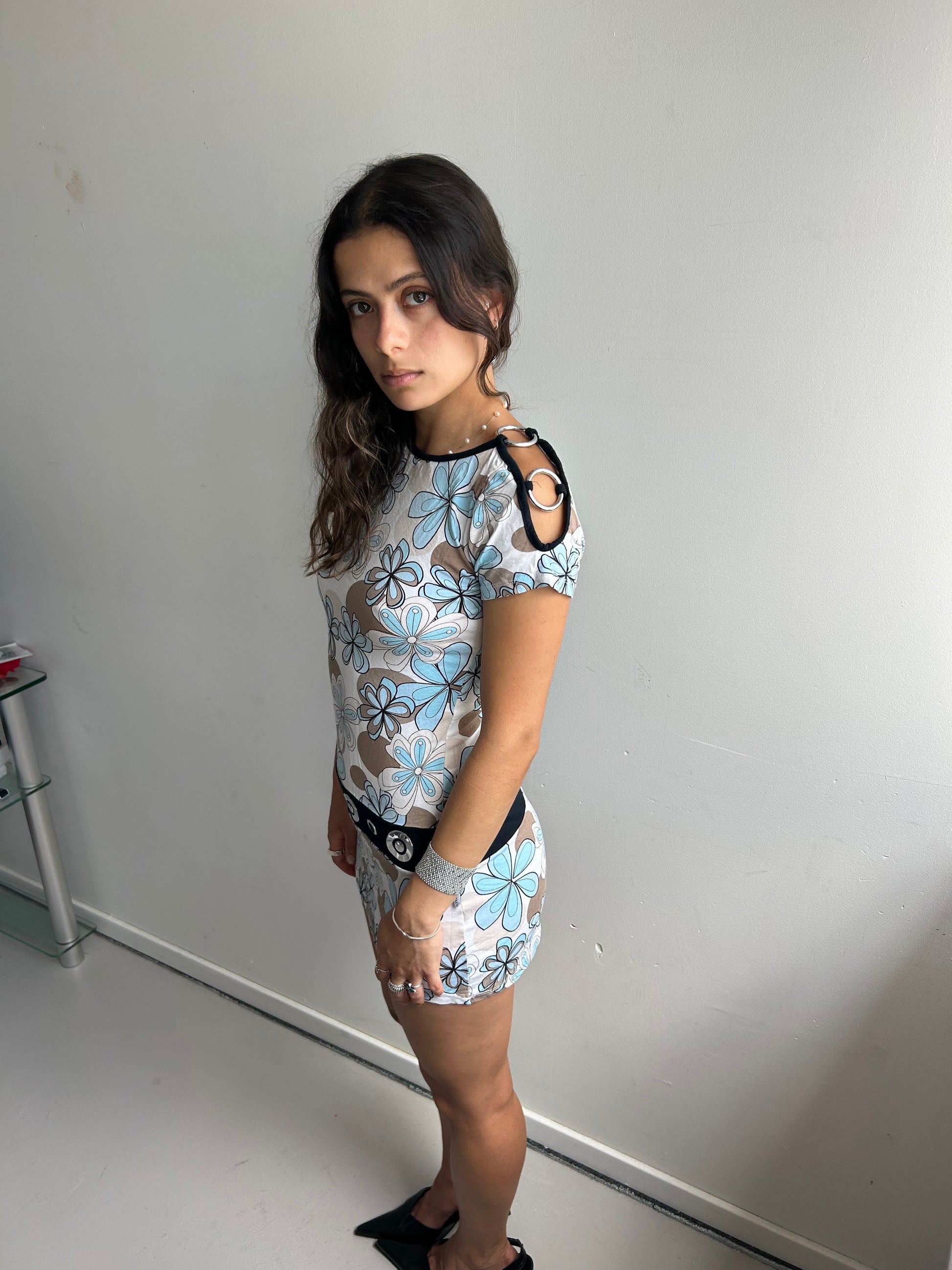 Stretchy mini dress with flower pattern and metallic shoulder cutout. Best for size XS-small M. Model wears size S and is 160cm tall. It is the definition of a mini dress, so girls with long legs might have their buttocks peak out.