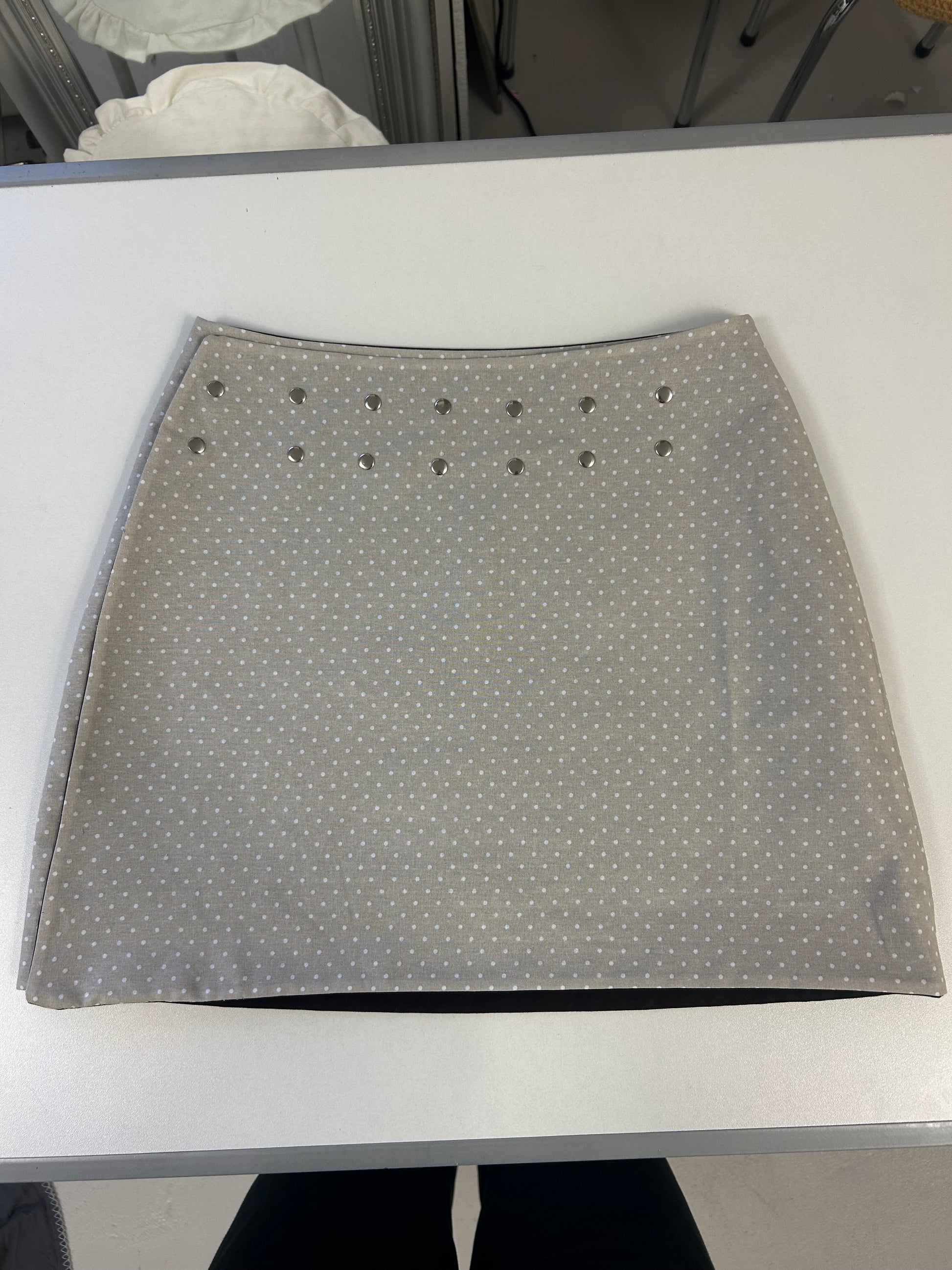 - Reversible wrap skirt in grey & beige polka dot design