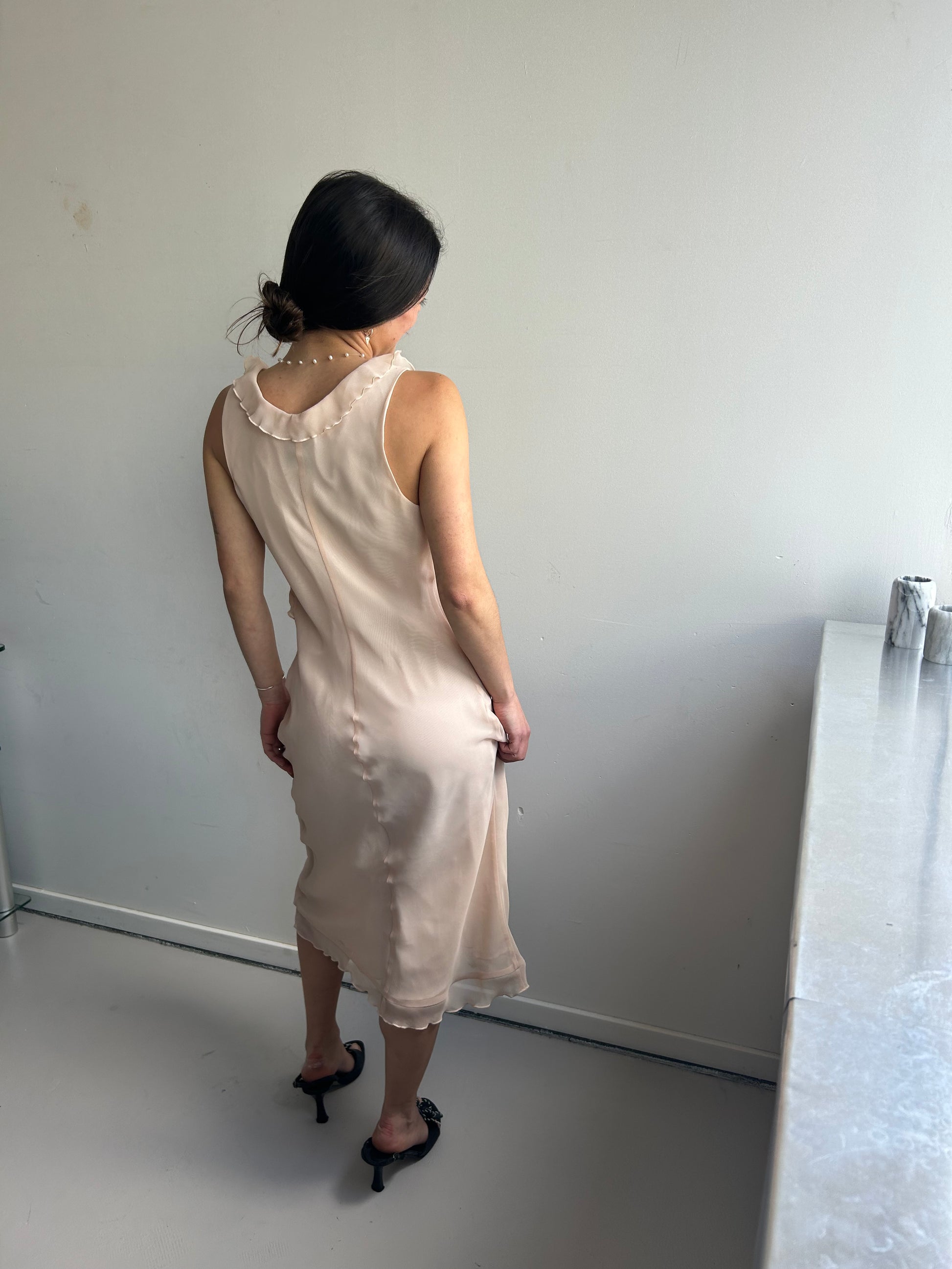 Soft, light blush-colored midi dress with a delicate, flowing silhouette. It features ruffled shoulder straps, a V-neckline, and a diagonal ruffle detail across the front. The hem is finished with a subtle layered ruffle, adding gentle movement. The fabric has a slightly satin-like texture. Best for size S. Model wears size S and is 160cm tall.