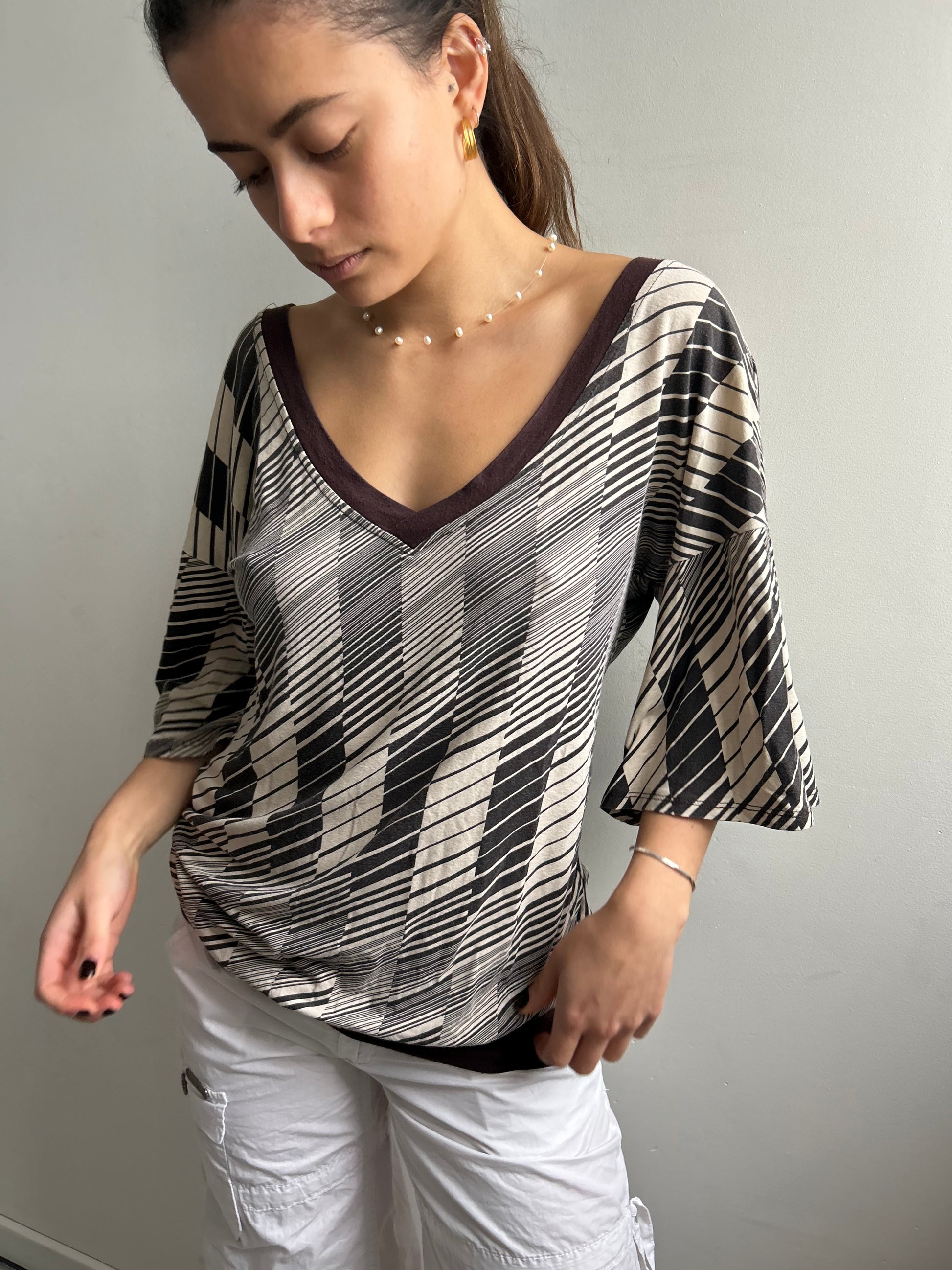 This flowy print tee in brown and beige features a V-neckline, with a brown waistband. Size unisex, can be worn by S-L. Model is size S.