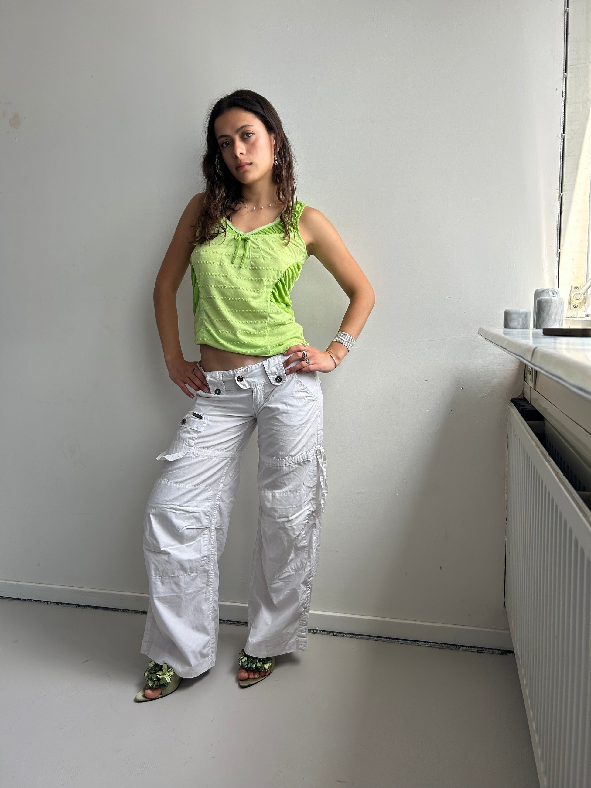Cargo pants in white with pockets in wide leg shape. Best for size S. Model is size S and 160cm tall wearing heels. Hence great for girls around 165-170cm.